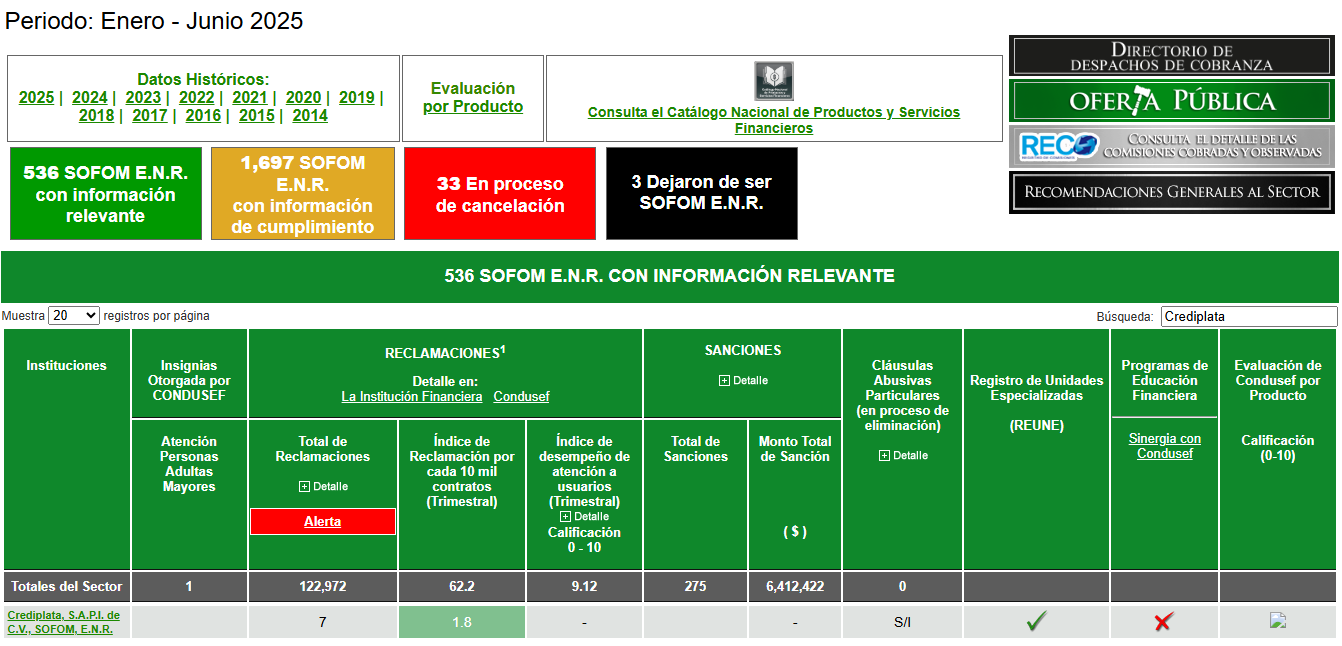 La información corresponde únicamente a Crediplata SAPI de C.V. SOFOM E.N.R. y para conocer la información de todo el sector, se podrá acceder al sitio http://www.buro.gob.mx